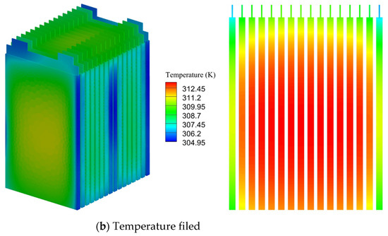 Figure 9 presents the flow field and temperature distribution from the simulation results at the end of the discharge process for Case 4. As shown in Figure 9a, the streamlines and velocity contours indicate a high-velocity zone near the air inlet, with a peak velocity of approximately 6.1 m/s. The streamlines also reveal several vortex regions in the airflow. Figure 9b illustrates that the maximum temperature is concentrated in the central region of the middle battery, while the battery’s surface maintains a relatively lower temperature profile. This temperature distribution can be attributed to the superior heat dissipation capability of the battery’s outer surface.