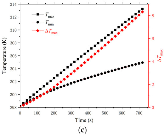 Characterization of temperature for Case 4: (a) Average surface temperature evolution of 16 individual batteries, (b) Surface maximum temperature difference of 16 single batteries, and (c) Temperature characterization of battery module.