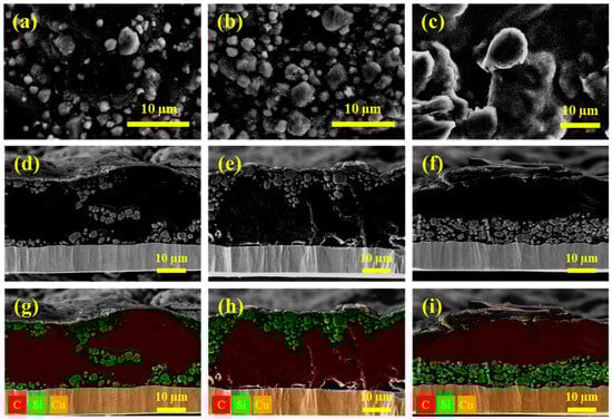 The surface (a–c) and cross-sectional (d–f) SEM images and EDX elemental mappings (g–i) of carbon (red), silicon (green), and copper (orange) of the SLE (a,d,g), Si-on-top DLE (b,e,h), and Gr-on-top DLE (c,f,i).