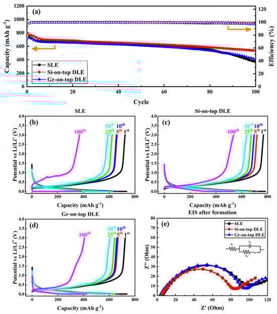 (a) The cycling performance at 0.5 C for 100 cycles, (b−d) the charge/−discharge profile at the 1st, 5th, 10th, 25th, 50th, and 100th cycles of the SLE, Si-on-top DLE, and Gr-on-top DLE and (e) the results of the EIS analysis after the formation process.
