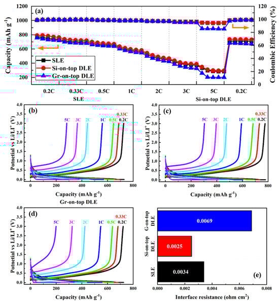 (a) Rate capability of each electrode at various current rates (0.2, 0.33, 0.5 1, 2, 3, and 5 C), (b−d) charge/−discharge profile at last cycle of each C−rate of SLE, Si-on-top DLE and Gr-on-top DLE, and (e) interface resistance.