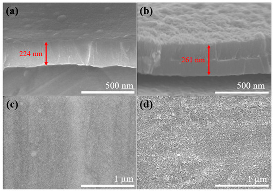 Figure 2a shows a thermal evaporation deposited silicon anode with a thickness of approximately 224 nm, while Figure 2b illustrates the layered Si/D/Si/D thin-film electrode. The rough surface morphology of the Si/D/Si/D anode might be attributed to the thicker anode. Since the thicker the silicon anode is, the worse the cycling performance is, the adverse effect of being a slightly thicker Si/D/Si/D anode than that of the Si anode will not affect the conclusion of the performance comparison as long as the thicker Si/D/Si/D anode performs better.