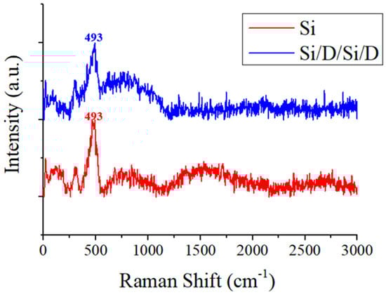 Compared to the characteristic Raman peak shown in Figure 3 of the crystalline silicon at 520 cm−1, the characteristic silicon peak of the deposited silicon thin film is at a lower wavenumber of 493 cm−1. This is due to the lower crystallinity of the deposited silicon thin film. Additionally, the red shift of the characteristic peak is consistent with the characteristics of the small-grain-sized polycrystalline silicon. The silicon thin films are amorphous or, at best, nanocrystalline [21,22].