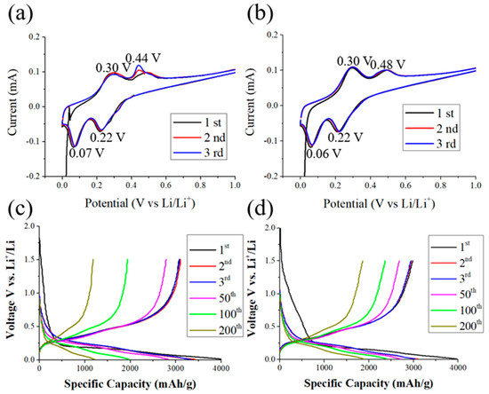 CV curves of (a) Si anode and (b) Si/D/Si/D anode at a scan rate of 0.05 mV/s. Charge–discharge curves of several cycle numbers for the (c) Si anode and (d) Si/D/Si/D anode.