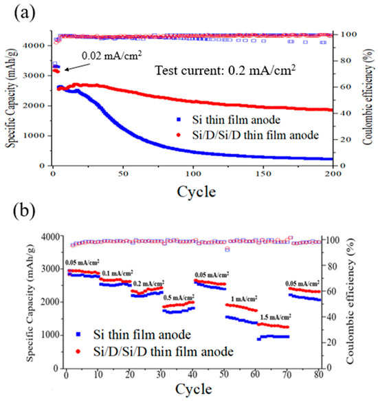 We tested both electrodes using a battery charge–discharge system in a voltage window between 0.01 V and 1.50 V and at a current density of 0.05 mA/cm2. The reversible capacities of the Si anode and the Si/D/Si/D anode for the first cycle were 0.143 mAh/cm2 (3077 mAh/g (si)) and 0.140 mAh/cm2 (2983 mAh/g (si)), respectively. In the first cycle, more SEI layers were observed in the Si/D/Si/D film during the initial electrochemical process. This is possibly due to the increase in the specific surface area of the rough electrode surface caused by diamond nanoparticles, leading to more initial SEI formation. However, the initial Coulombic efficiency of the Si/D/Si/D anode (75.1%) is comparable to that of the silicon anode (76.4%), indicating that the Si/D/Si/D structure can provide both a uniform and stable lithium ion transport path and a stable SEI film, avoiding the entrapment of silicon–lithium alloys during the cycling process. The calculation of the specific capacity is based on the weight of the silicon.