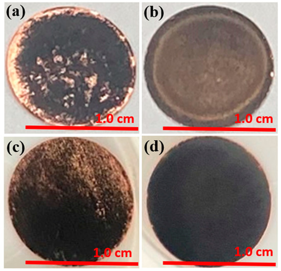 Figure 6a,c show optical microscope surface images of a silicon anode after (a) 200 cycles and (c) 80 cycles of C-rate testing. Figure 6b,d show optical microscope surface images of the Si/D/Si/D anode after completing (b) 200 cycles and (d) 80 cycles of C-rate testing, respectively. For the silicon anode, we observed that in some areas, the silicon film detached from the copper current collector. The overall electrochemical reaction was uneven with more silicon detachment on one side than the other of the electrode. The partial detachment of the silicon film from the current collector was displayed.