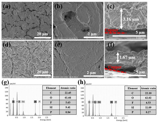 SEM images of (a,b) the surface of Si anode after 200 cycles at different magnification, (c) a cross-section of a Si anode; SEM images of (d,e) the surface of a Si/D/Si/D anode after 200 cycles at different magnification, (f) a cross-section of a Si/D/Si/D anode; EDS analysis of (g) a silicon anode and (h) a Si/D/Si/D anode after 200 cycles.