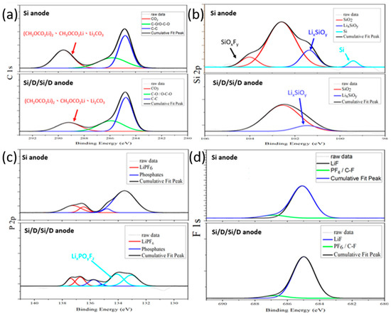 The surface of the silicon anode exhibited a higher phosphorus content than that of the Si/D/Si/D anode. It might originate from phosphates (POx), which is the main component of the SEI, or arise from side reactions between the silicon and electrolyte. The remaining fluoride content likely originated from residual electrolyte trapped in the solid electrolyte interphase.
