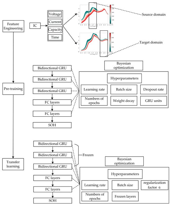 (2) The pre-training phase: The study employs a stacked bidirectional gated recurrent unit (SBiGRU) model to extract features, which are then fed into a fully connected layer for direct estimation of SOH. Additionally, Bayesian optimization and K-fold cross-validation are utilized to optimize hyperparameters, thereby enhancing the model’s learning ability and generalizability.