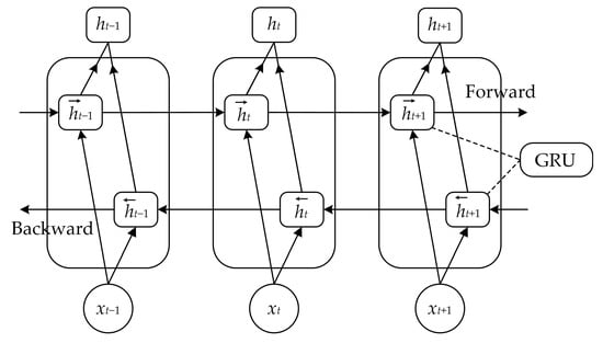 39]. This structure integrates information from both past and future contexts, achieved by stacking two independent GRUs: one processing the forward input sequence and the other the reverse input sequence. The final output is jointly determined by the hidden states of these two GRUs: