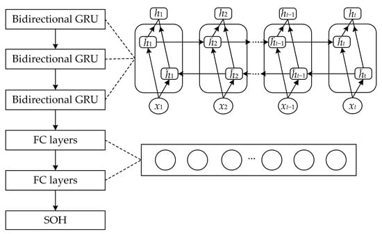 Stacking GRUs can construct a deeper GRU model. Within the framework of the stacked model, the output of the bidirectional hidden layer not only propagates over time but also inputs into the subsequent bidirectional hidden layer. This enables the model to capture correlations between input features across different time scales more effectively, thereby establishing nonlinear relationships between HI and SOH.