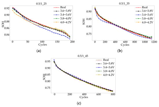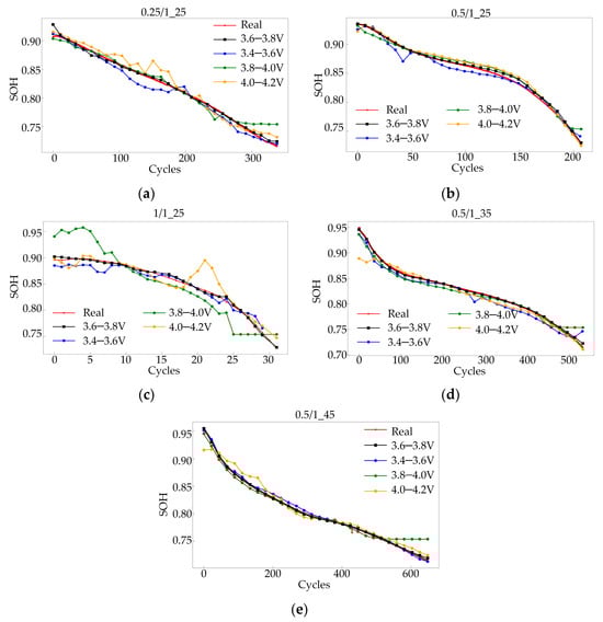 The highly nonlinear nature of the IC curve necessitates an investigation into the impact of extracting partial segment data from different voltage ranges on SOH estimation. The starting voltage of the charging process increases gradually with the number of cycles. In this study, the starting voltage is consistently set at 3.4 V, with a cutoff voltage of 4.2 V. Each voltage segment spans 0.2 V to ensure comprehensive data capture. These segments are categorized into the following ranges: 3.4–3.6 V, 3.6–3.8 V, 3.8–4.0 V, and 4.0–4.2 V. Comparative results are detailed in