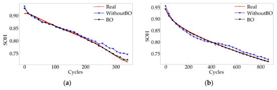 Here, and are the actual and model-predicted values of SOH for the ith sample, respectively. denotes the sample mean and N is the number of samples. The closer the MAPE and RMSE values are to 0, the better the model prediction. Similarly, the closer the R2 is to 1, the better the model prediction.