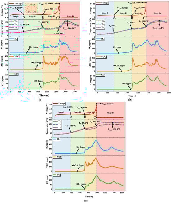 The segment of the four stages of overcharge TR and the changes in voltage, temperature, and gas concentration in various overcharge C-rate: (a) 0.5 C, (b) 0.75 C, (c) 1 C. [].
