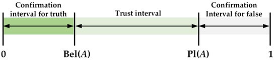 The relationship diagram between the Bel function, Pl function, and the trust interval is shown in Figure 4, where the degree of belief represents the lower bound estimate of the hypothesis credibility, and the degree of plausibility represents the upper bound estimate of the hypothesis credibility.
