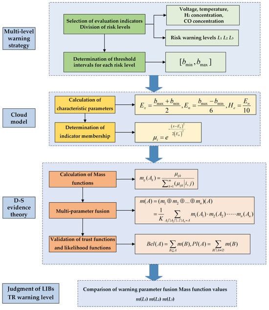 The process for evaluating the TR risk levels of LIBs based on the cloud model and DS evidence theory is illustrated in Figure 5.