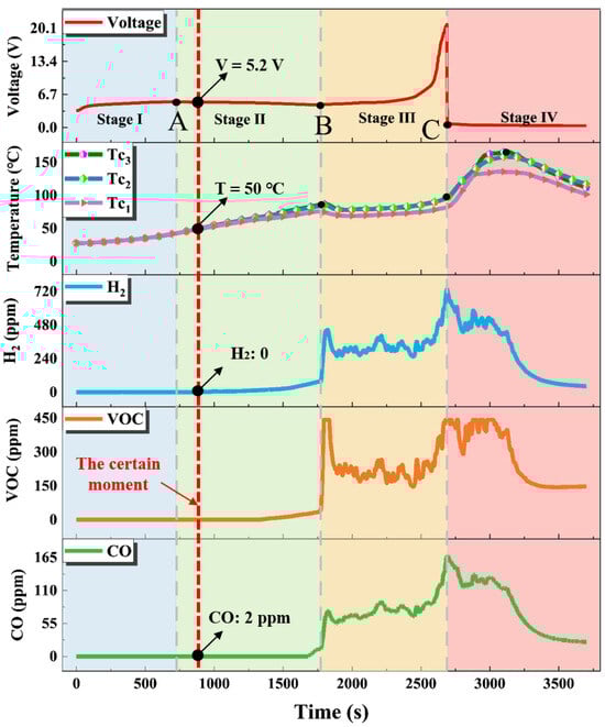 Taking the experimental results under a 0.5 C overcharge rate as an example, Table 2 depicts the voltage, temperature, and gas concentration variations throughout the four stages of TR. Meanwhile, Table 3 presents the gas concentration values at critical nodes.