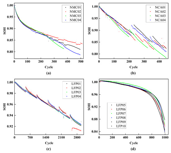 SOH decay curves for three battery material datasets: (a–c) for NMC, NCA, and LFP cells in Dataset A; (d) for LFP cells in Dataset B.
