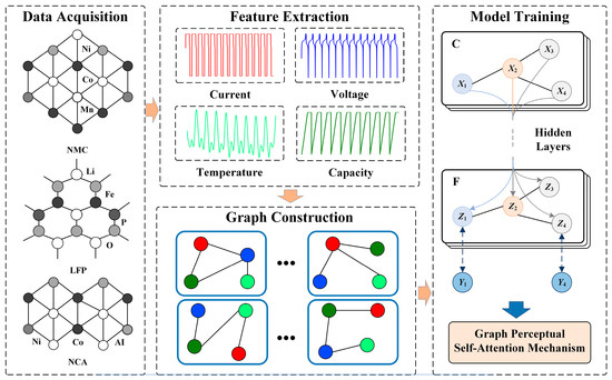 The entire framework process is illustrated in Figure 3. First, data from three different types of batteries are obtained, followed by feature extraction of key parameters such as current, voltage, temperature, and capacity. Then, a graph structure is constructed on the basis of these features. Finally, model training is conducted.