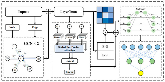 The fused features are input into a series of graph-aware multi-head self-attention layers, each of which is enhanced beyond the traditional self-attention mechanism. Initially, basic attention scores are calculated within these layers. Subsequently, edge features and the adjacency matrix are incorporated. By merging the query and key vectors of each node pair and processing them through a linear layer, edge features are created. These features, along with the adjacency matrix, modify the initial attention scores, shifting the focus of the attention distribution toward the actual connections within the graph, thus leveraging the graph structure information more effectively.