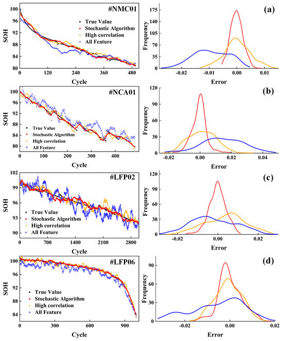 SOH estimation result curves (left) and error probability density curves (right) for different feature selections: (a) NMC01; (b) NCA01; (c) LFP02; (d) LFP06.