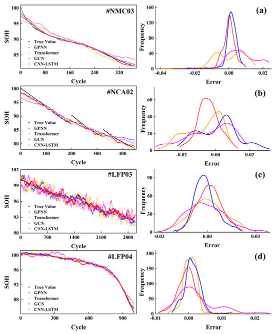 In this study, we evaluated the performance of four distinct models for estimating SOH of batteries across various types. The models assessed include the graph perceptual neural network (GPNN), transformer, GCN, and CNN-LSTM. Each of these models was trained via the optimal feature sets derived from our feature selection experiments. Figure 6 displays the SOH estimation results and the corresponding error probability density curves for each model. Table 4 presents the outcomes of the evaluation metrics.