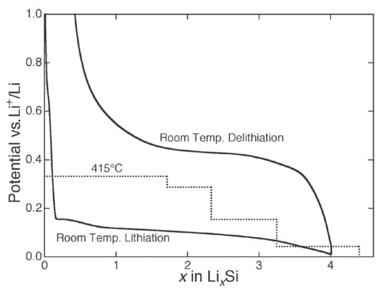 Electrochemical lithiation/delithiation curve of Si at high temperature (dotted line) and room temperature (solid line) [1]. Reprinted with permission from Ref. [1]. Copyright © 2013 WILEY-VCH.