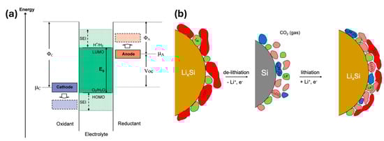 (a) Schematic open-circuit energy diagram of an electrolyte. ΦA and ΦC are the work functions, and μA and μC are the electrochemical potential of the negative and positive electrodes, respectively. Eg is the electrochemical stability window of the electrolyte. A μA > LUMO and/or a μC < HOMO requires kinetic stability via the formation of an SEI layer [61]. Reprinted with permission from Ref. [61]. Copyright © 2009 American Chemical Society. (b) Schematic diagram for the initial generation and evolution of the SEI layers on Si electrodes derived by EC-based electrolytes [60]. Reprinted with permission from Ref. [60]. Copyright © 2021 IOP Publishing Ltd.