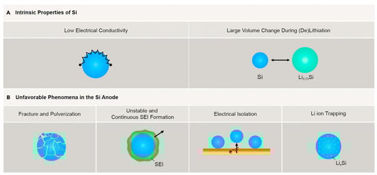Si particles exhibit intrinsic properties that lead to unfavorable phenomena in Si-negative electrodes (Figure 3). This section provides a detailed discussion of the various challenges associated with Si, specifically addressing extreme volume change, unstable SEI, and low electrical conductivity.