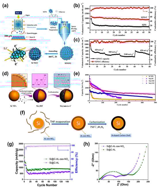 Core–shell structures consist of a sturdy inner core surrounded by one or more diverse material layers (shells). The outer carbon shell protects the Si core from environmental fluctuations, restricts volume expansion, and preserves structural integrity, thereby preventing the aggregation of the core into larger particles. Such architectures frequently exhibit enhanced chemical and physical properties relative to that of monolithic materials [104]. Hou et al. [32] synthesized a Si/C micro-/nanocomposite (SiNS/C) with a 3D plum pudding-like morphology through radiofrequency induction thermal plasma processing and subsequent spray drying using glucose as the carbon source (Figure 5a). This Si/C electrode demonstrated a high ICE of 88%, a high volumetric capacity of ~1244 mAh cm−3, and a stable rate performance compared with that of pristine SiNPs (Figure 5b,c). The enhanced electrochemical performance is attributed to the 3D structure, which accommodates volume changes, facilitates Li-ion transport, and enhances conductivity and stability through the carbon matrix. Luo et al. [33] investigated the impact of carbon-coating thickness on the long-term cycling performance of core–shell structures prepared by the sol–gel method, coating SiNPs with a phenolic-resin-based microporous carbon layer (Figure 5d). An analysis of samples with carbon shell thicknesses of 5, 10, and 15 nm showed that the 10 nm carbon shell displayed the highest capacity of 1006 mAh g−1 and a CE of 99.5% after 500 cycles at 500 mA g−1 (Figure 5e). A 10 nm carbon shell is optimal as it effectively alleviates internal stress caused by volume changes in SiNPs during cycling while facilitating fast Li-ion transport and stable SEI film formation. Precise engineering of the carbon shell thickness is crucial for balancing capacity and structural stability. Du et al. [34] synthesized carbon-coated SiNPs using alkali lignin (AL) or an AL-derived azo polymer (AL-azo-NO2) as carbon precursors. The Si@C composites were prepared by evaporating the THF solvent from the dispersion solutions of the SiNP/carbon precursors, followed by carbonization in a nitrogen atmosphere (Figure 5f). The AL-azo-NO2 precursor can synthesize an N-doped carbon shell, exhibiting superior electrochemical performance compared to that of AL-derived carbon shell. Si@C-AL-azo-NO2 demonstrated a high reversible capacity of 882 mAh g−1 at 200 mA g−1 with a high CE of 99% (Figure 5g) and a lower Rct value due to its N-doped carbon shell (Figure 5h). These results confirm that N-doped carbon significantly enhances electrical conductivity and improve electrochemical performance relative to undoped Si@C materials. However, during lithiation/delithiation, the volumetric expansion of the core SiNPs within Si/C core–shell structures can compromise the structural integrity of the carbon shell, potentially leading to the exposure of the Si core. Therefore, novel structures aimed at mitigating this issue have been a subject of discussion.