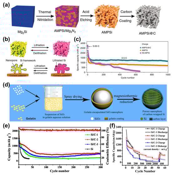 Synthesis process and electrochemical performance of carbon-coated porous Si materials. (a) Schematic of the preparation of AMPSi and AMPSi@C and (b) the lithiation/delithiation process of the AMPSi. (c) Long cycling test of AMPSi@C at 0.5 C after activating the first three circles at 0.05 C (1 C = 4.2 A g−1) [35]. Reprinted with permission from Ref. [35]. Copyright © 2019 nature. (d) Schematic illustration of the synthetic route to the carbon-coated porous Si nanospheres. (e) Cycling stability of p-Si, Si/C-1, Si/C-2, and Si/C-3 at a current density of 200 mA g−1. (f) Rate capability of Si/C-1, Si/C-2, and Si/C-3 at stepped current densities ranging from 100 to 2000 mA g−1 [36]. Reprinted with permission from Ref. [36]. Copyright © 2019 Elsevier Ltd.