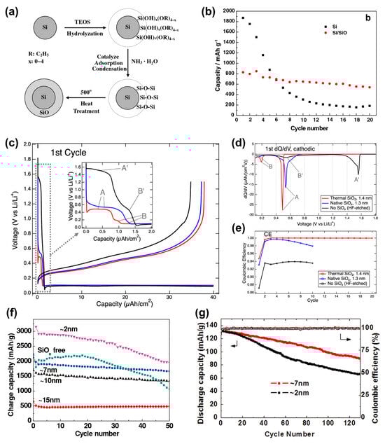 Synthesis process and electrochemical performance of SiOx-coated Si materials. (a) Schematic illustration of the formation of core–shell Si/SiO nanocomposite by a sol–gel and a following heat-treatment process. (b) Cycling behaviors of the Si/SiO nanocomposite and the SiNPs [38]. Reprinted with permission from Ref. [38]. Copyright © 2006 Elsevier B.V. Galvanostatic cycling of Si wafers with three different surfaces (a SiOx-free surface, native SiOx, and thermally grown SiO2 coatings). (c) First cycle (start of first cathodic half-cycle is enlarged in the inset, and differential capacity dQ/dV is presented in (d)). (e) CE [39]. Reprinted with permission from Ref. [39]. Copyright © 2020 American Chemical Society. (f) Plot of charge capacity vs. cycle number of half cells with 0, 2, 7, 10, and 15 nm SiOx coatings (after one cycle at 0.1 C rate, the rest of the cycles were at 0.2 C). (g) Plot of discharge capacity vs. cycle number of full cells (LiCoO2 core@shell bulk@nanowire Si) with 2 and 7 nm SiOx coatings at 0.2 C rate [40]. Reprinted with permission from Ref. [40]. Copyright © 2013 WILEY-VCH.