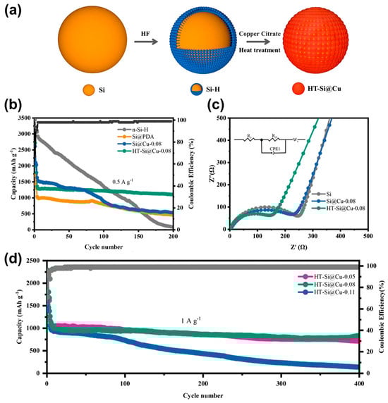 Cu is a highly suitable coating material for mitigating the severe volume expansion and low electrical conductivity of Si during cycling. Its excellent electrical conductivity effectively enhances the electrochemical performance of SiNPs. Moreover, Cu remains electrochemically inert in the presence of Li ions, thereby mechanically stabilizing the SiNPs throughout cycling. Kwon et al. [37] synthesized Cu-deposited mesoporous SiNPs (mp-Si@Cu) via magnesiothermic reduction and electroless deposition. The mp-Si@Cu nanocomposite exhibited high ICE, long-term cycle stability, a high capacity of 1569 mAh g−1 after 200 cycles at a current density of 1000 mA g−1, and superior rate capability compared with that of mp-Si and mp-Si@C. The superior electrochemical performance of mesoporous Si@Cu is attributed to the deposition of Cu onto the Si surface, which enhances the electrical conductivity, increases Li+ ion mobility, and improves the structural stability, restricting the aggregation and pulverization of Si. Xu et al. [96] investigated a novel coating method through in situ solution chemical deposition and subsequent heat treatment, which successfully coated a high-strength Cu-based metal shell onto SiNPs (formation of HT-Si@Cu). The treatment of SiNPs with dilute HF acid generates reactive hydrogenated Si (n-Si-H) on the surface, followed by the addition of copper citrate, and results in the immediate reduction of Cu2+ ions and the formation of a Si@Cu composite. Additionally, heat treatment in an Ar/H2 mixed atmosphere further strengthens the bonding between Si and Cu, resulting in the synthesis of heat-treated Si@Cu (HT-Si@Cu) (Figure 9a). Particularly, the HT-Si@Cu-0.08 electrode exhibited the best electrochemical performance, demonstrating superior cycling stability with a specific capacity of 1102 mAh g−1 and 85.7% capacity retention after 200 cycles at 0.5 A g−1 (Figure 9b). This performance is attributed to the high-temperature treatment, which effectively enhanced the contact between Si and Cu, facilitating the formation of a stable electrode interface. EIS results confirmed that the HT-Si@Cu-0.08 electrode had the lowest resistance (Figure 9c), indicating a significant improvement in electronic conductivity due to the additional heat treatment. Even after 400 cycles at 1 A g⁻1, it maintained a capacity of 837 mAh g⁻1 with 83.6% capacity retention, exceeding the cycling performance of previously reported Si/Cu electrodes (Figure 9d). This improvement is due to the enhanced conductivity provided by the Cu and Cu₃Si phases on the Si particle surfaces and the alleviation of stress caused by volume expansion.
