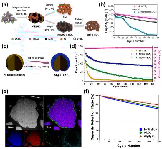 Synthesis process and electrochemical performance of metal oxide-coated Si materials. (a) Schematic illustration of the synthesis of the pSi and pSi-aTiO2 composite. (b) Cycle performance results of the non-porous Si, pSi, and pSi-aTiO2 electrodes at a specific current of 0.1 A g−1 [72]. Reprinted with permission from Ref. [72]. Copyright © 2021 Elsevier B.V. (c) Schematic illustration of the fabrication process for the amorphous TiO2-coated Si core–shell nanoparticles. (d) Cycling performance of the pristine Si, Si@a-TiO2, and Si@c-TiO2 nanoparticle electrodes at a current density of 420 mA g−1 (first activated with five cycles at 140 mA g−1). [71] Reprinted with permission from Ref. [71]. Copyright © 2017 WILEY-VCH. (e) Cross-sectional S/TEM-EDS image of the Al2O3-coated Si powder. (f) Cyclic performance of the N–Si alloy and Al2O3-1 and Al2O3-2 powders [84]. Reprinted with permission from Ref. [84]. Copyright © 2022 MDPI.