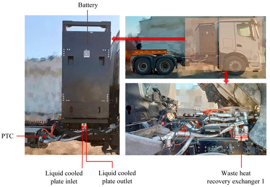 The ETBSm selected for the experiment is shown in Figure 2. The ETBSm includes a battery pack, PTC heater, pipelines in the thermal management system (wrapped in a silver insulation layer), waste heat recovery exchanger 1 (WHE), etc. The parameters of the ETBSm are shown in Table 1.