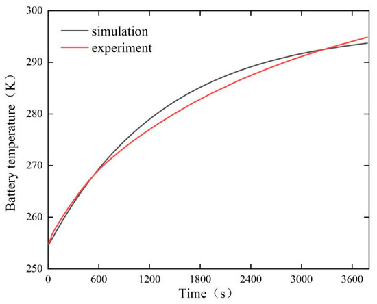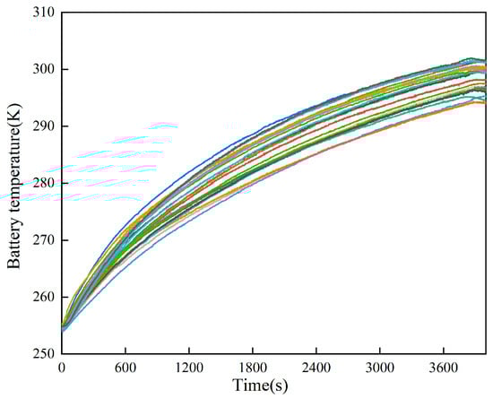 In total, 32 cells are tested without charging or discharging at an ambient temperature of 253 K. The experimental data of the battery temperature is shown in Figure 3. The experimental data show the coolant flow rate at the inlet of the battery liquid-cooling plate is 6 L/min and the temperature is 318 °C. The average battery temperature rises from 254.6 K to 296 K in 64 min, and the average temperature rate is 0.65 K/min.