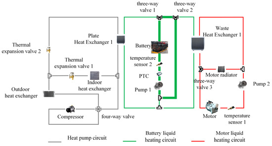 Based on the distributed thermal management framework, an integrated thermal management system framework with MWHR is proposed to enhance the utilization efficiency of motor heat, as shown in Figure 4. Electronic three-way valves have been added to the battery coolant and motor coolant circuits, respectively. A waste heat recovery exchanger1 is added to enable the motor coolant to exchange heat with the battery coolant, and the motor waste heat is utilized to heat the battery with the coolant as the transfer medium, and the heat generated by the motor is used to heat the battery through the coolant instead of being emitted to the external environment.