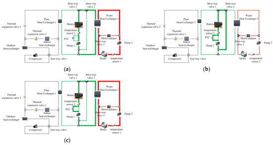 There are three different ways the coolant circulates in the integrated thermal management system during the heating process. These are illustrated in Figure 5a, which shows the PTC independent heating mode; Figure 5b, which shows the MWHR independent heating mode; and Figure 5c, which shows the PTC and MWHR cooperative heating mode.