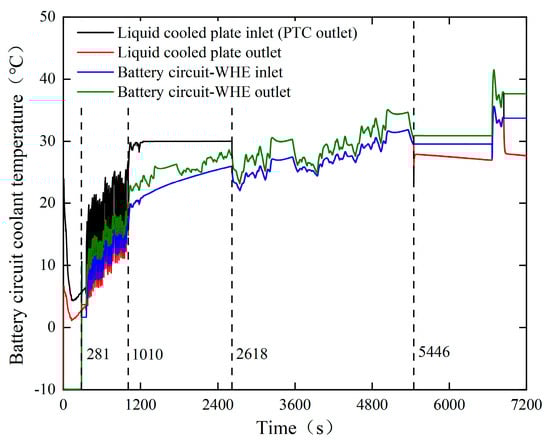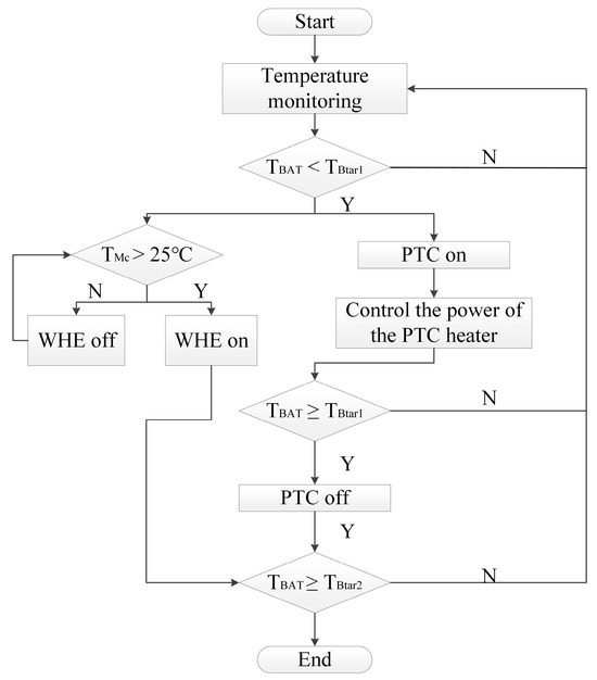 Under cold temperature conditions in winter, the main ways to heat the battery are internal heating and external heating [11,12,13]. The safety of internal heating still needs to be improved [14,15,16]. External heating is divided into convective heat transfer and heat conduction. Convective heating is mainly divided into air heating, liquid heating, and heat pump heating [17]. PTC can be used to heat the liquid [18]. An increase in the temperature of the heat transfer fluid can facilitate an accelerated rate of temperature rise within the cells. Yet, excessively high temperatures of the fluid can increase the temperature difference between the cells. The optimal inlet temperature for the heat transfer fluid has been demonstrated to be 30 °C [19]. Min et al. used a fuzzy control strategy to control the PTC heater to meet the battery temperature requirements, reducing the average heating energy consumption of the PTC by up to 3.35% [20]. The purpose of the above study is to reduce PTC energy consumption. This effect is important to address since, in cold climates, a large portion of the energy from the battery is spent on heating itself and the cabin, thus shortening the driving range by more than 30~40% [21].