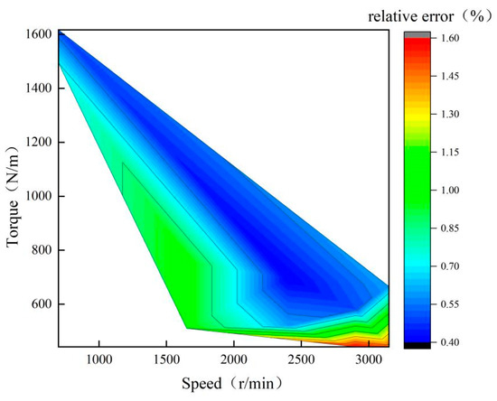 The motor efficiency is related to the heat production of the motor and the simulation verification of the motor efficiency as shown in Figure 9. The results show that the maximum value of the relative error of the simulation is less than 2% with the same rotational speed and torque. It proves that the motor efficiency and motor heat production are within the allowable error.
