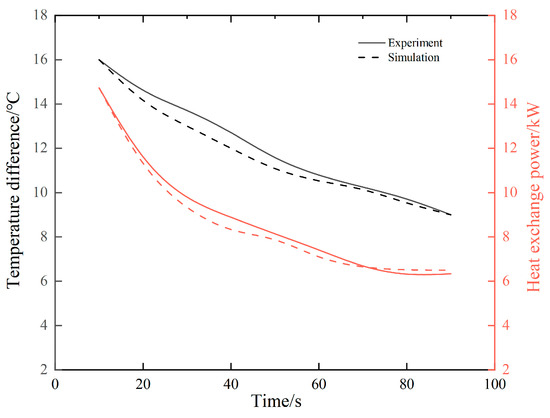 Figure 10 shows the temperature difference between the hot and cold ends of the WHE and the heat transfer power with time during the experiment and simulation. The initial conditions of the experiment and simulation are consistent. The inlet temperature of the coolant at the motor liquid circuit and the inlet temperature of the coolant at the battery liquid circuit in the WHE are set to be 30 °C and 21 °C, respectively. The experimental time is 90 s, and finally the outlet temperatures of the coolant at the motor liquid circuit and the battery section are measured to be 28 °C and 25 °C, respectively. From Equation (13), the finally average heat exchange is about 6.3 kW. The error between experiment and simulation is less than 5%. This experiment can provide a reference for the efficiency of the WHE.