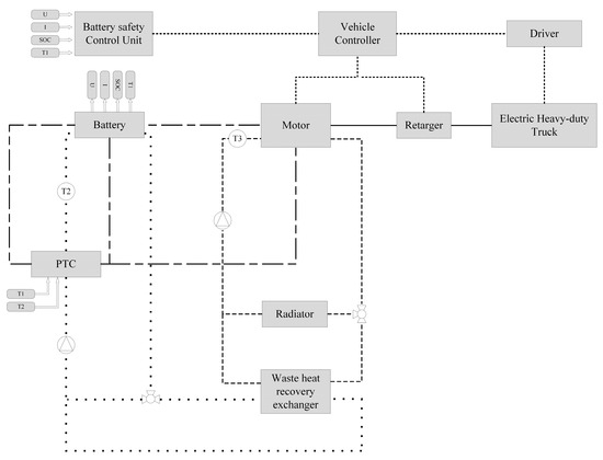 There is limited research on the heating of heavy-duty truck batteries. Different from passenger cars, ETBSm require a larger battery capacity than passenger cars [29]. In research on high-capacity batteries, Babu et al. studied the heat production characteristics of large-capacity batteries in a low-temperature environment. It is helpful to predict the average temperature of the battery and provides a reference for battery preheating [30]. In order to reduce the energy consumption of heating batteries in electric heavy trucks, Babu also adds insulation to the outside of the battery in order to save heating energy at low temperatures. The results showed a 9% increase in energy consumption for heavy trucks at −25 °C [31]. Research on waste heat recovery from fuel cell trucks can provide a reference for waste heat recovery on ETBSm. Mohamed et al. have demonstrated the possibility of waste heat recovery from a fuel cell system using a thermoelectric generator under varying vehicle speed and powertrain configurations with up to 2% heat [32] recovery. Lee et al. apply a novel triple-fluid heat exchanger to recover waste heat from the fuel cell stack and electric devices at different temperatures. Its driving range can be increased by about 10.8% [33]. Hu et al. use waste heat from fuel cells to heat the cabin, with a maximum saving of about 4.27% of total hydrogen consumption [34]. At present, there are few studies on thermal management systems for ETBSm with MWHR.