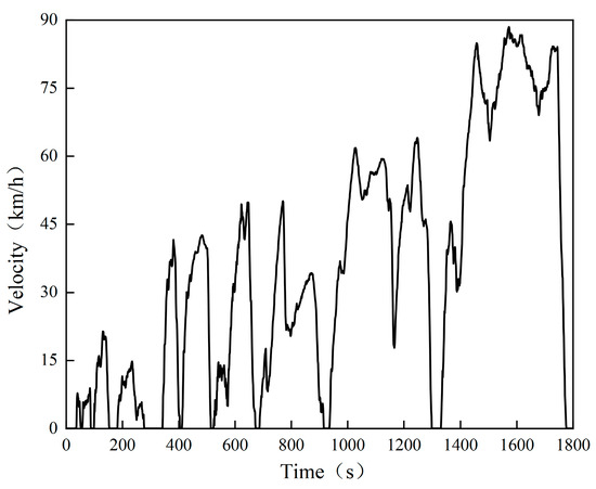 where, is the resistance of the PTC heater (Ω). I is the current of the PTC heater (A). Set the target temperature of the PTC heater to 30 °C. When the coolant temperature at the inlet of the battery liquid cooling plate is lower than 30 °C, the PTC resistance value is 20~25 Ω. When the coolant temperature is greater than or equal to 30 °C, the resistance value rises rapidly, and the PTC heating power decreases to zero, which ensures that the PTC heats the battery coolant temperature with a maximum value of 30 °C.