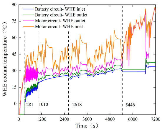 where, is the amount of the WHE (W), is the heat transfer coefficient (W/(m2·K)), is the heat transfer area in the WHE (m2), is the temperature of the coolant at the motor liquid circuit in the WHE (K), is the temperature of the coolant at the battery liquid circuit in the WHE (K).