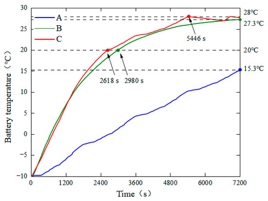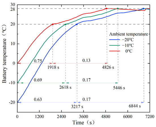 Based on working mode C, the characteristics of the influence of ambient temperature on the battery temperature and temperature rise rate are analyzed. It is assumed that the initial battery temperature is the same as the ambient temperature. The battery temperatures at ambient temperatures set to 0 °C, −10 °C, and −20 °C are shown in Figure 19. The results show that the battery temperature all rises faster in the initial stage and then slows down. The time for the battery to reach TBtar1 at initial temperatures of 0 °C, −10 °C, and −20 °C is 1918 s, 2618 s, and 3217 s, respectively, and the temperature rise rates are 0.63 °C/min, 0.69 °C/min, and 0.75 °C/min. The time for the battery temperature to reach TBtar2 is 4826 s, 5446 s, and 6844 s, respectively, and the temperature rise rates of the battery in the time from TBtar1 to TBtar2 are 0.17 °C/min, 0.17 °C/min, and 0.13 °C/min, respectively.