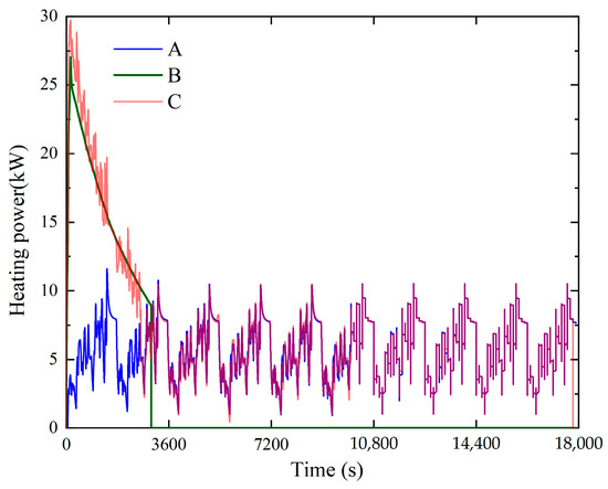 When the ETBSm is driven under the Chinese heavy-duty vehicle commercial vehicle test cycle (CHTC), the simulation mode is set as shown in Table 3: A. Motor waste heat is used to heat the battery; B. PTC is used to heat the battery; C. PTC and motor waste heat are used together to heat the battery. The control strategy of an integrated thermal management system is used in both working modes A and C. In working mode B, only the PTC is used to heat the battery up to 28 °C.