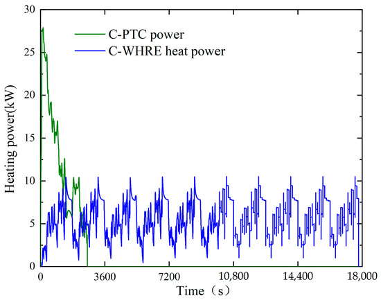 Working modes B and C are compared to determine their impact on PTC heating power. The analysis showed that both modes exhibited a general downward trend in PTC heating power. However, the initial state of PTC heating power is higher in working mode B, and its trend showed a linear decline. On the other hand, working mode C showed an increase in PTC heating power in some stages. This is due to the utilization of residual heat from the WHRE power, which declined during that time. To meet the heating demand, PTC heating power increased. The final energy consumption of PTC in working mode B is approximately 21.77 kW·h, while the final energy consumption of PTC in working mode C is approximately 11.13 kW·h. This means that the energy consumption in working mode C reduced relatively by 10.64 kW·h, which accounts for about 95.6%.