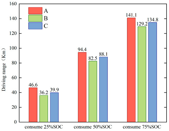 The driving range of the ETBSm is directly affected by the power consumption of its PTC. Figure 18 shows a comparison of the driving range under different modes. Mode A offers the largest driving range, followed by mode C and then mode B. Mode A has a maximum driving range improvement of 11.9 km as compared to mode B, but the battery temperature rise rate has not been taken into consideration. For mode C compared to mode B, the driving range improvement is approximately 3.7 km, 5.6 km, and 5.6 km at 25%, 50%, and 75% SOC consumption. The relative proportion of the improvement value is 10.2%, 6.8%, and 4.4%.