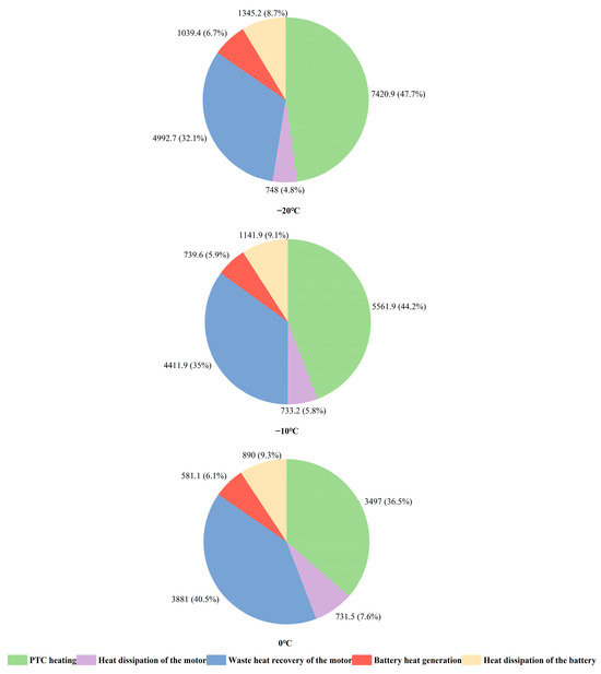 Lower ambient temperature and increased heating demand cause changes in the heat of each part. The larger driving range of changes is the PTC heating capacity and the waste heat utilization of the motor; the law is as follows: The ambient temperature decreases from 0 °C to −10 °C and −20 °C; the PTC heating capacity increases, from 3497 W to 5561.9 W and 7420.9 W, respectively; the proportion of all the heat increases, from 36.5% to 44.2% and 47.7%, respectively; the waste heat utilization of the motor increases, from 3881 W to 4411.9 W and 4992.7 W, respectively; but the proportion of all heat decreases, from 40.5%, 35%, and 32.1%, respectively. The absolute value of the spontaneous heat production of the battery increased due to the increase of the internal resistance of the battery when the ambient temperature decreased. Moreover, the temperature difference between the battery and the environment is larger, and the heat emitted from the battery to the air also increases.