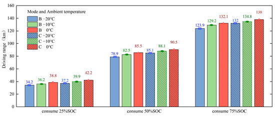 To compare the characteristics of ambient temperature on the driving range, the driving range of ETBSm is analyzed after changing the ambient temperature at the same discharge depth. The driving ranges of working modes B and C at different ambient temperatures are shown in Figure 21. At ambient temperatures of −20 °C, −10 °C, and 0 °C, with the same SOC consumed by the batteries, the driving range of ETBSm can be effectively increased by mode C compared with mode B. The driving range of ETBSm can be increased by mode B when the ambient temperature increases. When the ambient temperature increases, the driving range of both mode C and mode B increases to different degrees.
